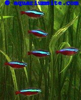 Cardinal Tetra is one of the finest and most popular species. It is a small school fish which must be kept in groups of at least ten individuals. The more the better; a large school is not only more natural for this shoal fish but also a much more impressive sight in a home aquarium. Cardinal Tetra's natural habitat is slow or standing waters of Amazon. It prefers clear water and dim-light areas shaded by terrestrial plants. Especially the fry has a kind of light phobia. The eggs are generally laid at night in total darkness. Cardinal Tetra inhabits rather shallow waters up to a depth of 40 cm and avoids fast currents. Because breeding Cardinal Tetra is a relatively difficult task most specimens sold in pet shops are wild caught animals. The acclimatization of such wild caught fish might present some problems due to the weakened immune systems caused by the stress of transport. First weeks are very critical and substantial losses are common. But once successfully acclimatized Cardinal Tetra is not a difficult fish which may live five or more years in a home aquarium. Especially wild caught fish are prone to kidney disorders if kept in hard water. Soft and acidic water (GH < 4 d, pH < 7.0) is recommended for a long-run health. Cardinal Tetra required very soft and acidic water for breeding. The breeding aquarium must be located in a shadowy place. Ideal water conditions: Conductivity as low as 15-20 micro siemens (GH almost zero), pH 5.5-6.2, temperature 26-28 C. Pure water from reverse-osmosis can be used for breeding after peat filtering. A young pair (7-8 months old) must be chosen for breeding. Up to 500 adhesive eggs are scattered around on fine leaved plants. Parents must be removed after spawning because they are notorious egg eaters. The eggs hatch in about 28 hours. Raising the young requires patience because the fry of this species needs fine food for quite a long period of time (up to 8 weeks). Freshly hatched brine shrimp larvae must be supplemented with infusoria. |