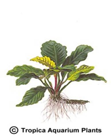 Anubias barteri "coffeefolia" is a very beautiful, low variety of Anubias barteri. It is characteristic that the leaves arch considerably between the leaf ribs, and the new leaves are red-brown. The colour combination and leaf shape make it an attractive variety in both large and small aquariums. It flowers frequently under water but does not produce seeds there. Anubias species seem to grow so slowly that they do not realise that they have been submerged. It is not eaten by herbivorous fish. |
