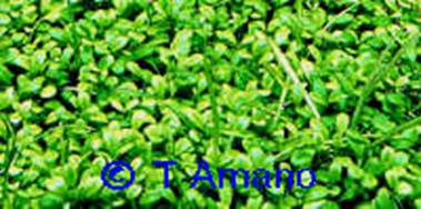 Glossostigma elatinoides is a fast growing amphibious plant and the submerged culture soon builds a very nice looking carpet. However, this carpet building growth form requires quite high light intensities as Glossostigma elatinoides responds to low light by a much more upright stem and thereby the flat looking growth is lost. Glossostigma elatinoides prefers soft water with pH <7. it is one of the smallest aquarium plants and very popular in japanese aquaria built after the Nature Aquarium concept. |