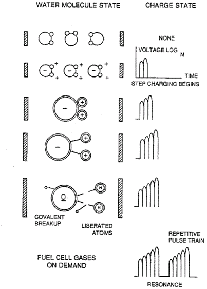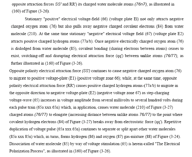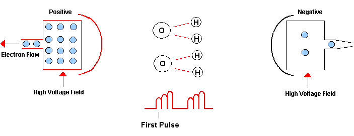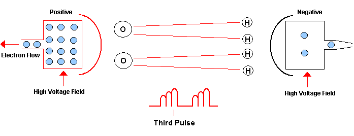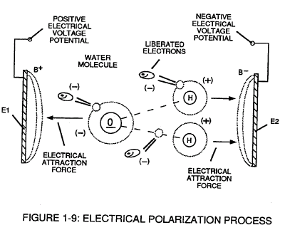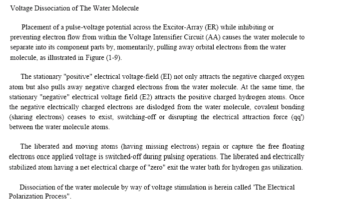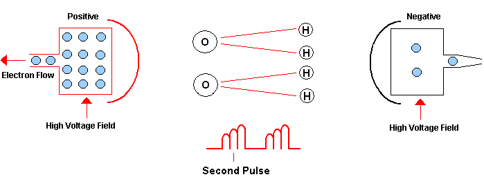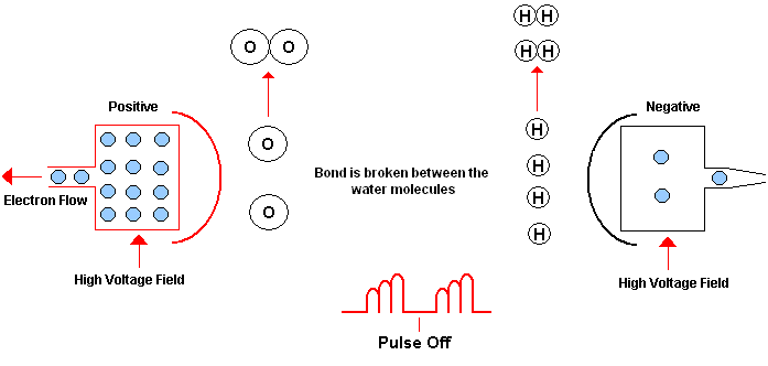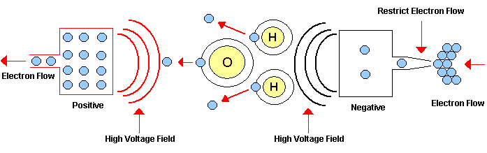 Electrostatic force chemically bonds the atoms of the water molecule. Stanley knew that if you raised voltage to a certain level electrons could be stripped of the water molecule. During this process the bonding force between the atomic structures of water is weakened.