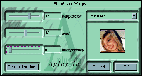 A positive value for warp factor expands out the image, as if it were painted on the surface of an inflating balloon. A negative value contracts the image towards the center point. This is equivalent to the Photoshop 'Pinch' operator, but can be combined in conjunction with the Warp and the Twirl (see below) using the A Warper plug-in.