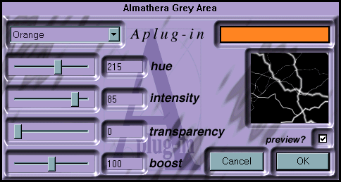 You can use the mouse to draw a guide-line on the preview image that specifies the start and end position of the main lightning bolt. You can then adjust the style of the lightning with the three slider bars: