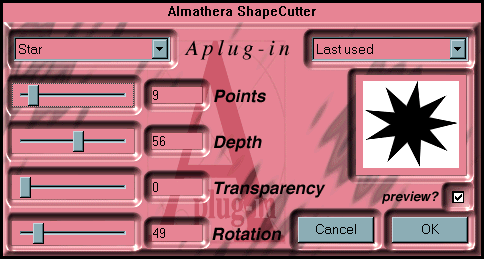 Now select your main RGB channels again, and load the channel you previously created as the selection. You now have a star-shaped selection ready to apply other effects. You can adjust which type of shape you want with the top drop-down list. The four slider-bars underneath alter the shape and style of the selected object.