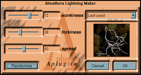 These values select guidelines for the style of lightning, which is totally random based on the values you select. To generate a different lightning pattern based on the same settings, click on the 'Randomise' button, until you get a lightning pattern that you like.