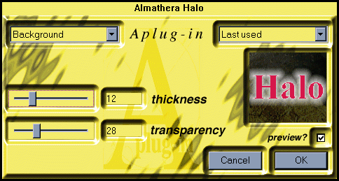 This specifies the width of the halo. The large the thickness the slower it is to calculate (depending on the speed of your computer, large thickness settings can slow down the preview window significantly).