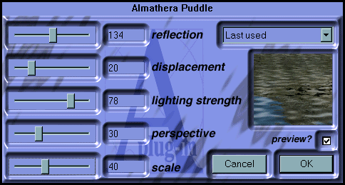 The perspective determines the apparent angle of the selected water surface to produce the three-dimensional effect. At zero no perspective is applied as if you are looking straight down at the puddle.
