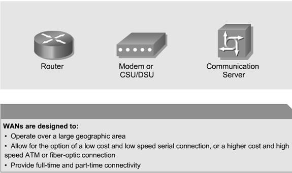 A WAN operates at the physical layer and the data link layer of the OSI reference model. It interconnects LANs that are usually separated by large geographic areas. WANs provide for the exchange of data packets and frames between routers and switches and the LANs they support.