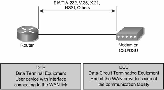 The WAN physical layer describes the interface between the data terminal equipment (DTE) and the data circuit-terminating equipment (DCE). Generally, the DCE is the service provider and the DTE is the attached device. In this model, the services offered to the DTE are made available through a modem or a CSU/DSU.