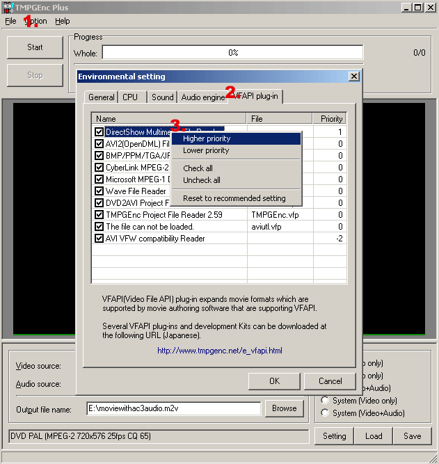 Start TMPGEnc and close the Wizard. First change the Directshow priority in