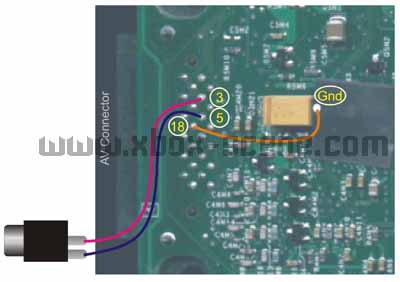 3. Solder a wire from Pin 5 on the AV connector to the outside (ground) leg of