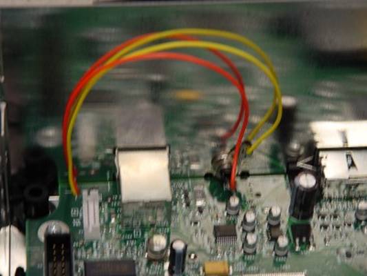 * There is a hole in the mainboard located near the LAN connector, it is right next to where the '8' co-ordinate is printed. This hole is big enough to fit the power wires through so the optical connector can be above the mainboard when reassembled, the 3rd (data) wire will fit through another smaller hole located between the AV connector and the LAN connector, just above the pin 3 hole of unused J6A1, if you cant squeeze 3 wires through the other larger hole.