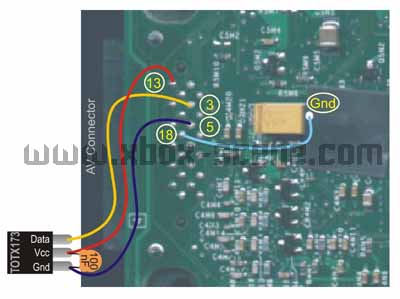 5. Solder another wire from Pin 13 of the AV connector to the Vcc leg of the