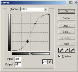 The line in the "Curves" dialogue box will appear as a diagonal. Click on this diagonal line twice and drag these two markers until your line forms an "S" shape (as shown above). The lower marker will increase the black values as you pull it down. The upper marker will decrease the grey values as you pull it up. The exact shape of YOUR "S" curve will depend on YOUR signature image, so watch your image as you move these markers until you achieve the desired result.