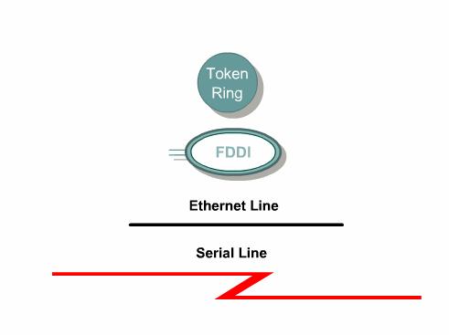 circle. FDDI is represented by two concentric circles and the Ethernet symbol
