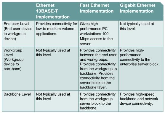 Ethernet is the most widely used LAN technology and can be implemented on a variety of media. Ethernet technologies provide a variety of network speeds, from 10 Mbps to Gigabit Ethernet, which can be applied to appropriate areas of a network. Media and connector requirements differ for various Ethernet implementations.