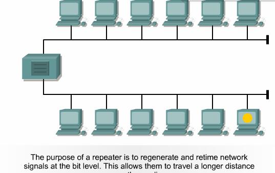 Repeaters regenerate and retime network signals and allow them to travel a longer distance on the media. Hubs are multi-port repeaters. Data arriving at a hub port is electrically repeated on all the other ports connected to the same network segment, except for the port on which the data arrived. Sometimes hubs are called concentrators, because hubs often serve as a central connection point for an Ethernet LAN.