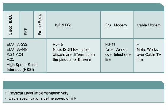 WAN connection types include high-speed serial links, ISDN, DSL, and cable modems. Each of these requires a specific media and connector. To interconnect the ISDN BRI port to the service-provider device, a UTP Category 5 straight-through cable with RJ-45 connectors, is used. A phone cable and an RJ-11 connector are used to connect a router for DSL service. Coaxial cable and a BNC connector are used to connect a router for cable service.