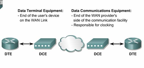 If the connection is made directly to a service provider, or a device that provides signal clocking such as a channel/data service unit (CSU/DSU), the router will be a data terminal equipment (DTE) and use a DTE serial cable. Typically this is the case. However, there are occasions where the local router is required to provide the clocking rate and therefore will use a data communications equipment (DCE) cable. In the curriculum router labs one of the connected routers will need to provide the clocking function. Therefore, the connection will consist of a DCE and a DTE cable.