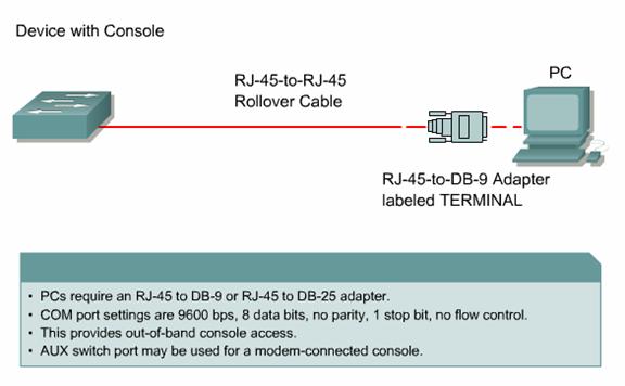 To initially configure the Cisco device, a management connection must be directly connected to the device. For Cisco equipment this management attachment is called a console port. The console port allows monitoring and configuration of a Cisco hub, switch, or router.