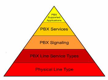 The PBX stack is a representation of the various layers of functionality supported by a PBX. The lists of items for each layer are illustrative and not complete.