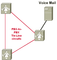 This graphic shows the replacement of the private network that was providing a virtual tie line between the two PBXs. Now, there is a Frame Relay/ATM network connecting the two PBXs. The connections to the PSTN are for off-net calls.