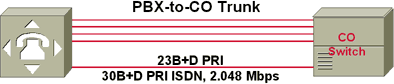 This graphic is an overview of PBX-to-CO and PBX-to-PBX legacy connectivity. Typically, the connection is a T1 in North America, Japan, Taiwan, and South Korea; or an E1 in Europe and the rest of the world.