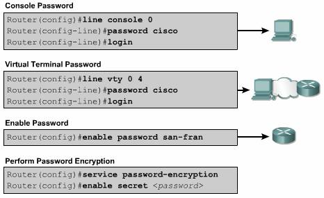Passwords restrict access to routers. Passwords should always be configured for virtual terminal (vty) lines and the console line. Passwords are also used to control access to privileged EXEC mode so that only authorized users may make changes to the configuration file.