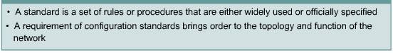 A standard is a set of rules or procedures that are either widely used or officially specified. If an organization does not have standards, the network will be in chaos if a service interruption occurs.