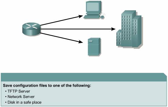 Configuration files should be stored as backup files in the event of a problem. Configuration files can be stored on a network server, on a TFTP server, or on a disk stored in a safe place. Include documentation with the offline information.