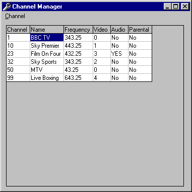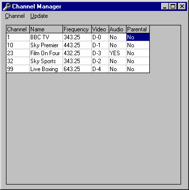 The Channel Window allows the operator to view all the channels defined for the Head End.