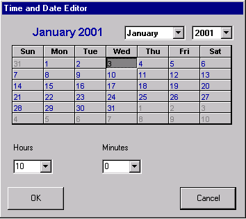 The Date is selected by the Calendar; also there are small pull down menus located to the right of the Month, Year, Hours and Minutes