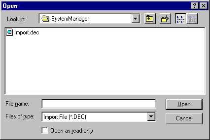 If the operator presses the "Import" button then they are prompted to browse for an Import File named with an extension *.dec