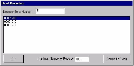 The "Decoder Serial Number" box allows the operator to type in to find a specific Used Decoder Serial Number