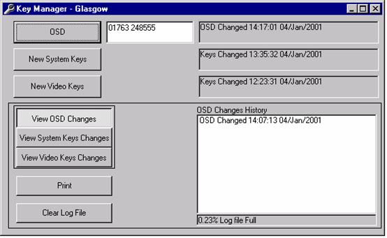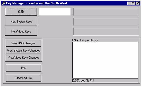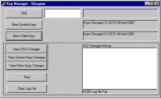 The operator is able to update the Video keys by pressing the "New Video Keys" Button, the last time the Video keys were changed is displayed in the Window opposite or alternatively all Video Key Changes can be viewed by pressing the lower "View Video Keys Changes" box