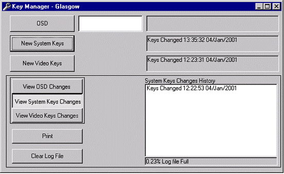 The operator is able to update the System keys by pressing the "New System Keys" Button, the last time the System keys were changed is displayed in the Window opposite or alternatively all System Key changes can be viewed by pressing the lower "View System Keys Changes" box
