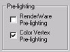Load the sample file 'vertex lighting example.max' from the RenderWare3 SDK. Textured building façade lit buy several attenuated Omni lights. The geometry has already been prelit using the Assign Vertex Colors 3DS Max Utility. You will see a Vertex Colors modifier in the Edit Stack.