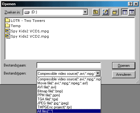 Open de VOB files door de 1e VOB file te kiezen van de film: VTS_01_1.VOB, de rest wordt automatisch gepakt.