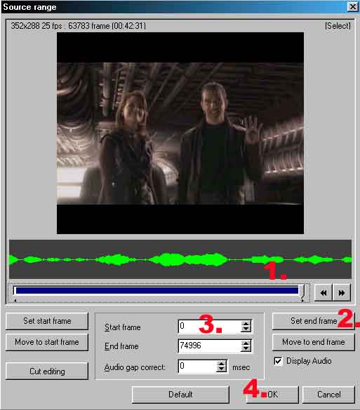 uitleggen. 2) Klik op 'Set end frame' (je hebt nu zojuist het einde van de film ingesteld). 3) Zet de 'Start frame' op : 0 (je hebt nu zojuist het begin van de film ingesteld). 4) Klik op 'OK' , gevolgd door nog een keer 'OK' Je bent nu weer in het beginscherm van TMPGenc. Het enigste wat je nu nog moet doen is op 'Start' klikken (linksboven) Klaar! TMPGenc begint nu flink te rekenen en zorgt ervoor dat jij een perfecte DVD als eindresultaat krijgt. De snelheid hiervan hangt af van je processor (de snelheid van je computer). Met een pentium 4 - 1.7 Ghz duurt dit "ripproces" ongeveer 3 uur. Ikzelf gebruik als besturingssysteem Windows 98SE. Windows XP werkt ook goed.(Deze heb ik ook getest) |