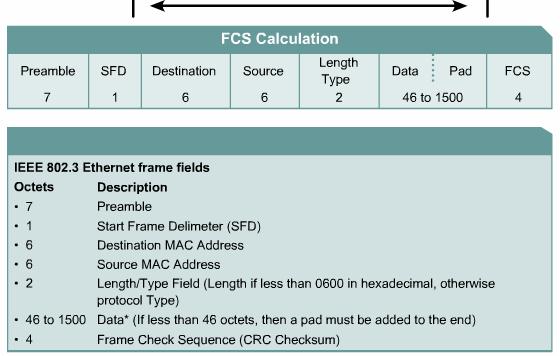 All frames are susceptible to errors from a variety of sources. The Frame Check Sequence (FCS) field of an Ethernet frame contains a number that is calculated by the source node based on the data in the frame. At the destination it is recalculated and compared to determine that the data received is complete and error free.