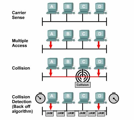 Examples of deterministic protocols include Token Ring and FDDI. The carrier sense multiple access with collision detection (CSMA/CD) access method is a simple non-deterministic system. The NIC listens for an absence of a signal on the media and starts transmitting. If two nodes or more nodes transmit at the same time a collision occurs. If a collision is detected the nodes wait a random amount of time and retransmit.