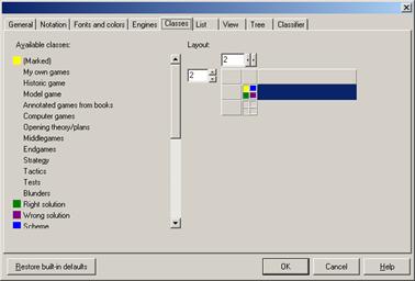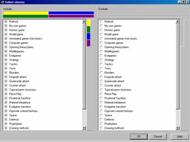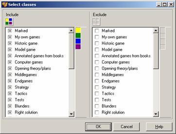 To include a game in a class in the View mode, select the Edit | Add | remove from classes in the main menu. To include a set of games in a class in the List mode, call Edit | Add dataset to classes; and to exclude it, select Edit | Remove dataset from classes.