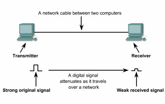 Attenuation, which is signal deterioration, and noise, which is signal interference, can cause problems in networks because the data sent may be interpreted incorrectly or not recognized at all after it has been received. Proper termination of cable connectors and proper cable installation are important. If standards are followed during installations, repairs, and changes, attenuation and noise levels should be minimized.