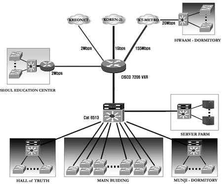 Hwaam Dormitory and Server Farm. ICU network connect to the internet via 4 WAN: