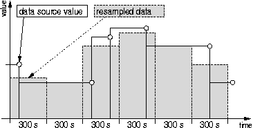 An RRD can be configured to accept data from a number of data sources in parallel. A data source can be anything, be it an octet counter or the output of a temperature sensor. Each RRD operates at a configurable base time resolution. All data coming from the data sources is re-sampled at this resolution. The re-sampling of the data takes care of the problem that it is not always possible to get new data at the desired point in time but further processing and storage is much simpler when the data is equally spaced along the time axis. Figure 3 shows the re-sampling process for a counter type data source at a 300 second interval. Counter values may arrive at irregular intervals, but data can only be stored in the RRD at fixed interval. The re-sampling ensures that data points are available for every 300 second interval while the size of the area below the curves is kept constant. The basic idea behind improving logging performance was to reduce the amount of data which has to be transfered between memory and disk. This is achieved by storing data in a round robin manner into preallocated storage areas called Round Robin Archives (RRA) inside the RRD. Each Round Robin Archive has its special properties for time resolution, size and consolidation method. The update interval of an RRA must be a multiple of the base update interval of the RRD. Several values at the RRD's base resolution are consolidated into one value at the RRA's resolution using the consolidation method defined for this RRA. An array of pointers identifies the most current entry in each RRA, such that only one write operation is necessary to update an RRA.