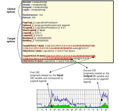 MRTG has the ability to monitor any SNMP OID that a host can deliver. MRTG tasks are running based on the options present in the configuration file. A configuration file is required for each (or multiple) monitored targets. It contain the <target> option tag that describes the OIDs that MRTG will ask a target host for. The format of the <target> option tag is: