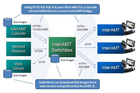 Intel AMT Switchbox is a Software Tool that connects to and manages Intel AMT machines on a network. It is built in C and runs on Windows, UNIX and MIPS platforms (Routers). An IAMT management console like Intel AMT Commander or a Web Browser (Internet Explorer 7 and 6, Firefox 2.0 and 1.5) or Telnet can connect to Intel AMT Switchbox in TLS or non-TLS mode, authenticate once, and manage all of the Intel AMT machines that are under the control of this Switchbox.