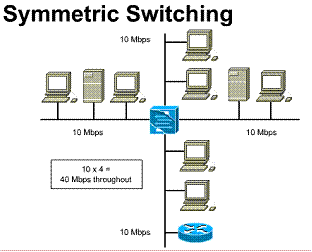 Symmetric switching is one way of characterizing a LAN switch according to the bandwidth allocated to each port on the switch. A symmetric switch provides switched connections between ports with the same bandwidth, such as all 10 Mbps or all 100 Mbps ports. A symmetric switch is optimized through even distribution of network traffic across the entire network