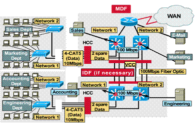 This is an example of a segmented Ethernet network. The entire network has 15 computers (6 file severs and 9 PCs). Without segmenting the network all 15 devices would need to share the same 10Mbps bandwidth and would reside in the same collision domain.