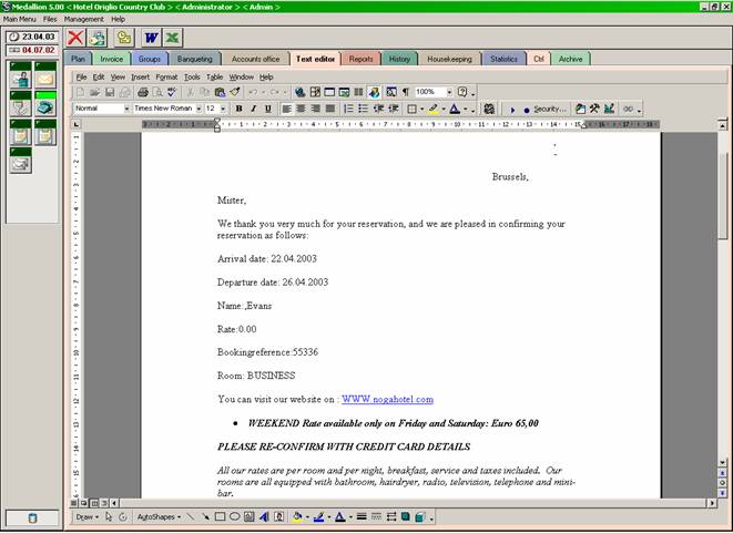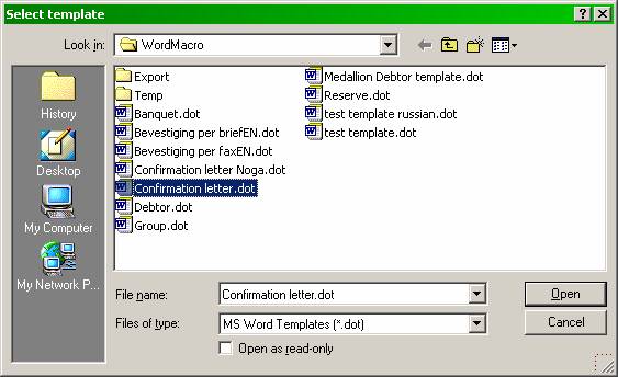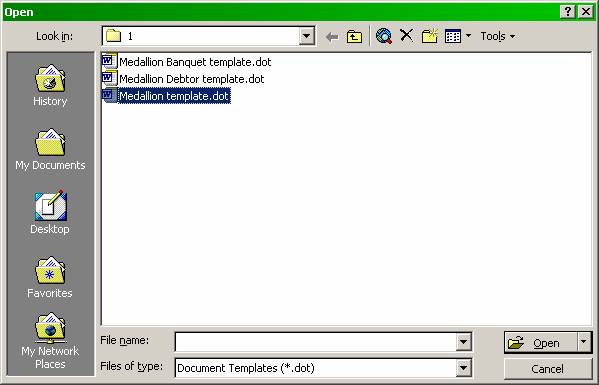 Open Word-File Open-select Medallion template.dot for creation of confirmation letter template for reservation or group master, Medallion Banquet template.dot for creation of confirmation letter template for banquet reservation or Medallion Debtor template.dot for creation of confirmation letter template for debtor invoices(Carta remesa), Select Open