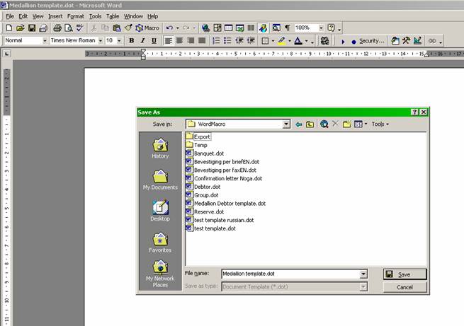 When the Confirmation letter is ready-Save file as –Give the template a certain name but keep it as a template file like Confirmation letter.dot in “Macro templates folder” (See 1.1.2) and Press Save